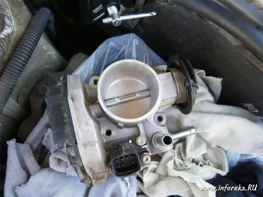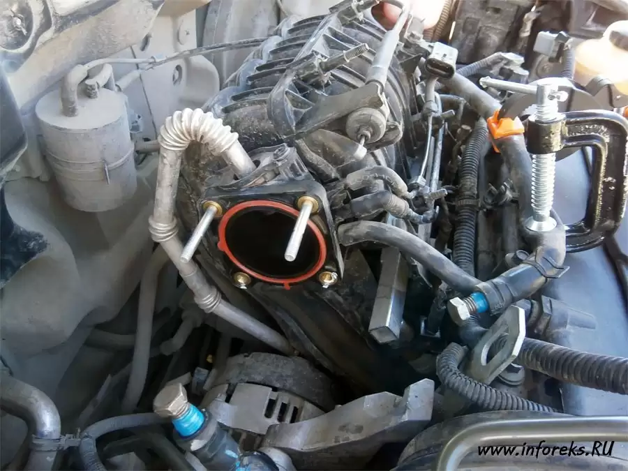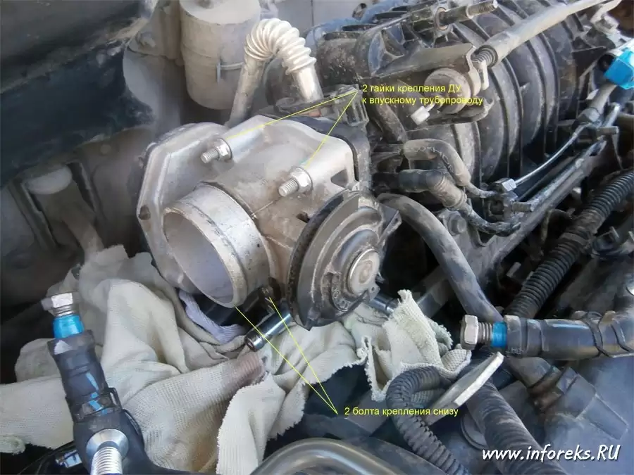 Вооружившись головкой на 10 мм отворачиваем две гайки (сверху) и два болта (снизу) крепления дроссельного узла к впускному трубопроводу (рис. 5) и снимаем дроссельный узел (рис. 6).