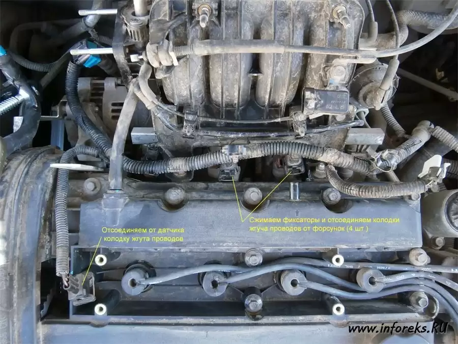 Снимаем декоративную накладку двигателя. Отсоединяем от датчика колодку жгута проводов (Рис.9). Далее сжимаем фиксаторы и отсоединяем колодки жгута проводов от форсунок. Теперь мы получили возможность убрать в сторону большой жгут с проводами, который мешал нам, закрывая форсунки (Рис 10).