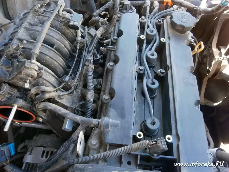 Все операции во избежание получения ожогов будем проводим на остывшем двигателе. Важно! В самом начале отсоединяем минусовую клемму с аккумулятора. Откручиваем крышку с расширительного бачка охлаждающей жидкости — сбрасываем избыточное давление в системе охлаждения двигателя. Снимаем гофрированный шланг от воздушного фильтра, ведущий к дроссельной заслонке и откручиваем четыре винта крепления крышки корпуса воздушного фильтра. Пассатижами ослабляем хомут и отсоединяем шланг системы вентиляции картера от шланга подвода воздуха к дроссельной заслонке.