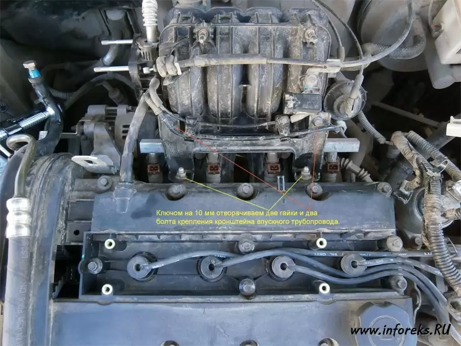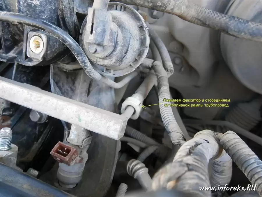 Головкой на 10 мм отворачиваем две гайки и два болта крепления кронштейна впускного трубопровода (Рис. 12). Снимаем кронштейн (Рис. 13). Сжимаем фиксатор и отсоединяем от топливной рампы трубопровод (Рис. 14, 15).
