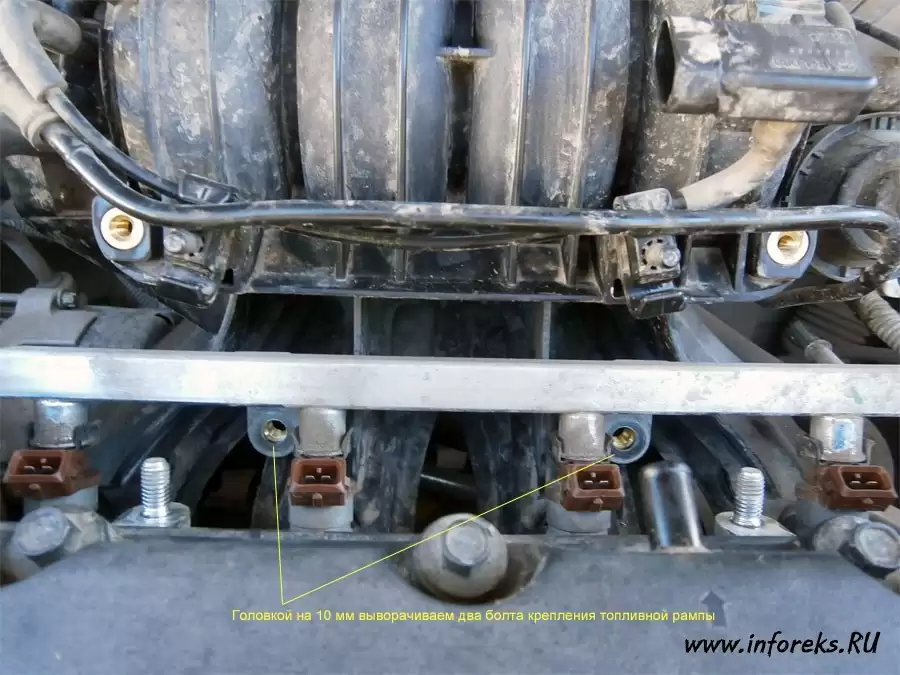 Головкой на 10 мм выворачиваем два болта крепления топливной рампы (Рис. 16). Аккуратно, слегка пошатывая вперед-назад, снимаем топливную рампу в сборе с форсунками (Рис. 17).