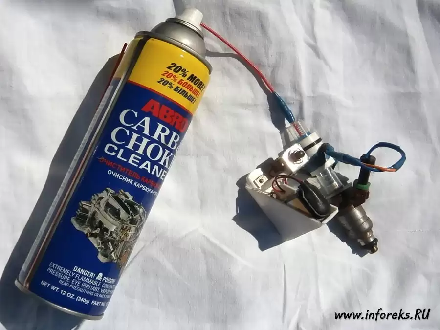 Пассатижами или пальцами снимаем фиксатор П-образный с форсунки и извлекаем форсунку из топливной рампы. Теперь приступаем к операции промывки форсунок. Ничего сложного здесь нет. Нам потребуется все тот же баллончик очистителя для карбюраторов ABRO (либо любой другой аналогичный), и вот такое компактное и нехитрое устройство (Рис. 18, 19).