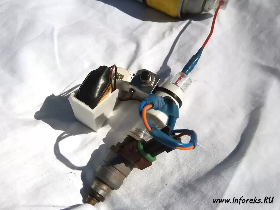 Устанавливаем форсунку в пластиковую оболочку 5 мл шприца. Входит достаточно плотно, поэтому закреплять ее больше чем-нибудь нет никакой необходимости. Единственно, лучше иметь пару таких шприцов под рукой, т.к. после промывки 3-ей форсунки шприц разнашивается и из-за давления форсунка может из него вылетать. Промывочную трубку красного цвета (которая идет вместе с баллоном ABRO) вставляем в узкую часть шприца, которую предварительно чуть расширяем с помощью шила, гвоздика и т.п. Место входа трубки в шприц заматываем изолентой. Подсоединяем ВАЗовский штекер к форсунке. Вставляем трубочку в баллон ABRO. Одной рукой жмем на кнопку распыления очистителя (нагнетаем под давлением промывочную жидкость в шприц), второй рукой удерживаем наш девайс и жмем несколько раз на кнопку переключателя (замыкаем/размыкаем цепь). При нажатии (отпускании) кнопки переключателя происходит открытие (закрытие) форсунки. На выходе визуально виден сам процесс распыления. До промывки, из форсунки были заметны струи. После, факел в виде «тумана», что есть «гуд».