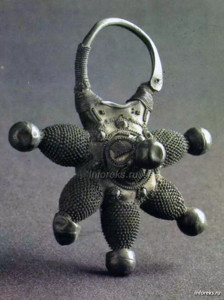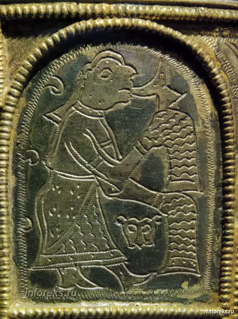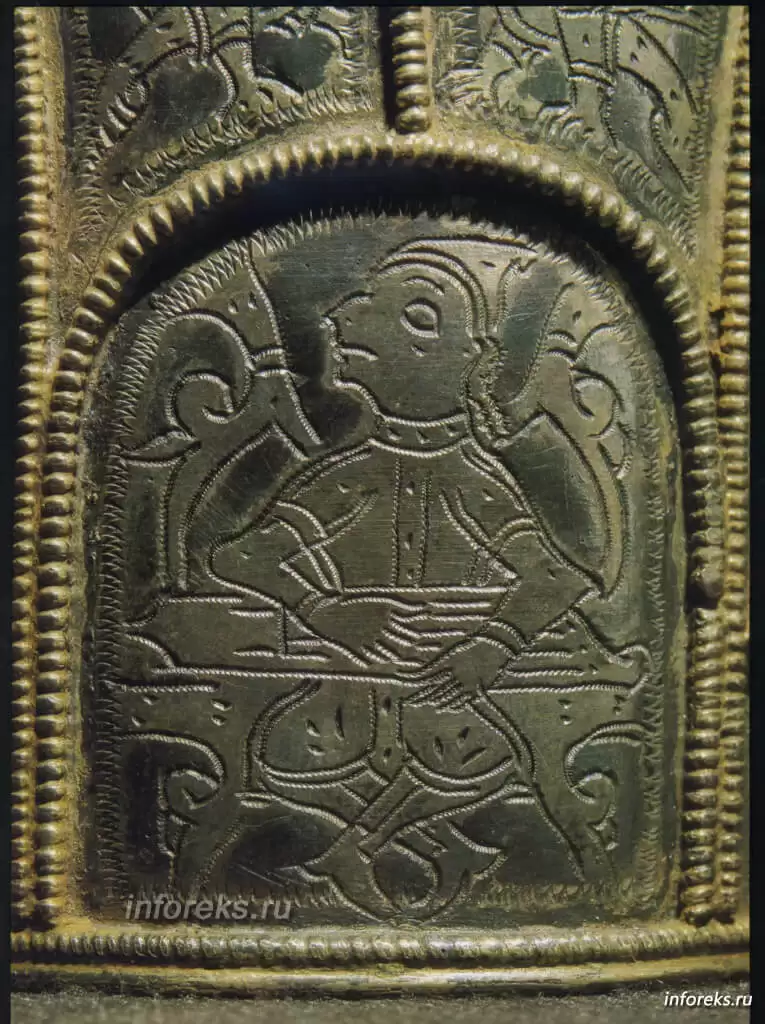 Нужно упомянуть еще об одном шедевре, поистине фантастическом произведении ювелирного искусства из Старой Рязани — миниатюрном окладе креста. Хотя размер его не превышает 4×4 сантиметра, на его поле разбросаны мелкие самоцветы в золотой оправе среди 120 золотых тончайшей работы цветов, каждый из которых, размером меньше двух миллиметров, имеет лепестки, пестик, тычинки и раскачивается на спиральном золотом стебельке. Здесь мы снова видим зарождавшиеся в эту эпоху реалистические тенденции древнего рязанского искусства, определившие почти полное отсутствие стилизации. Ничего подобного этой скани не известно в ювелирном искусстве других княжеств Руси того времени.