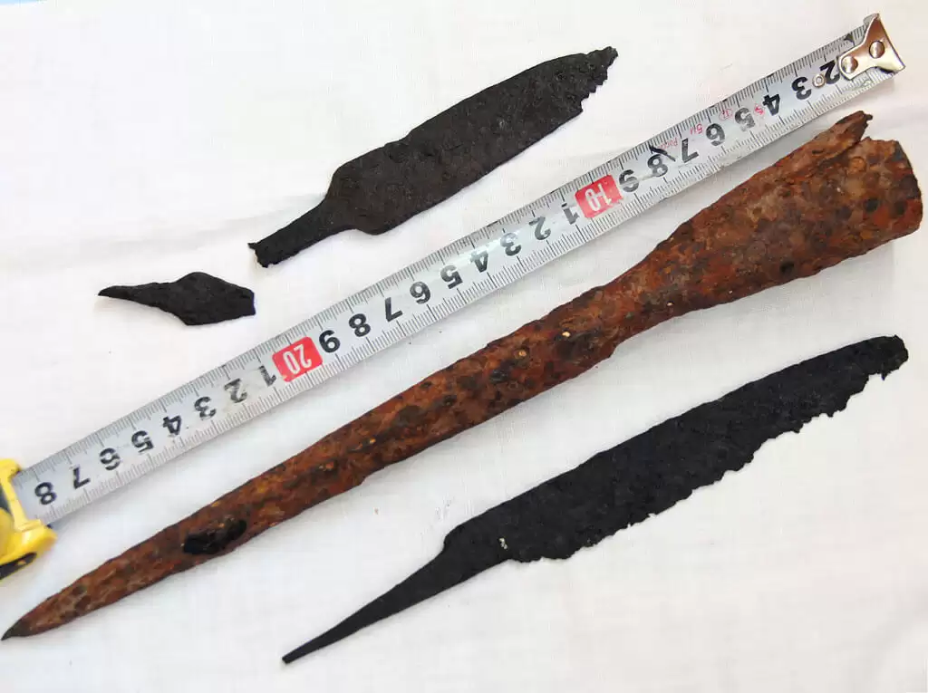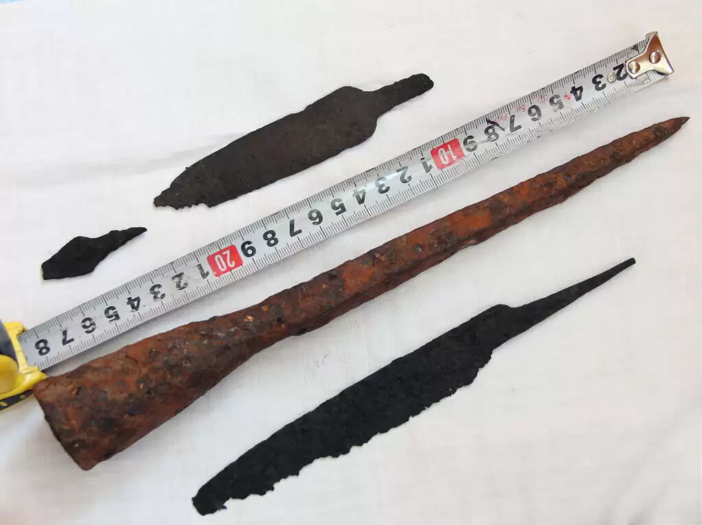 Из находок больше всего порадовали серебряный дирхем (жаль, что попался только один) и старинный наконечник бронебойного копья (пики). Судя по классификации А.Н. Кирпичникова (“Древнерусское оружие. Копья”) копье с пером в виде четырехгранного стержня и воронковидной тульей относится к периоду X-XII вв. Артефакт достаточно хорошо сохранился. Метал крепкий, а само острие — как игла. Обрабатывать его ничем не стал. Найденные в лесу наконечник стрелы и пару ножей были очень истлевшими и хрупкими. Покрыл их воском для консервации.