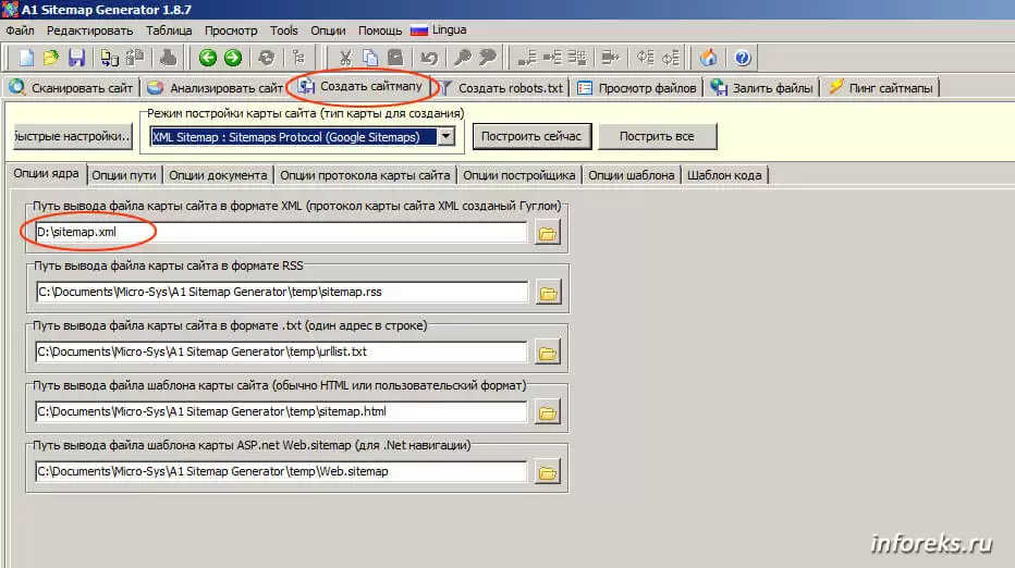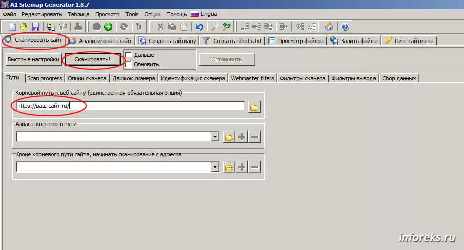 Для создания карты сайта нужно открыть вкладку “Сканировать сайт”, ввести адрес нашего сайта (это единственная обязательная опция) и нажать кнопку “Сканировать!” Далее, переходим на вкладку “Создать сайтмапу” и жмем “Построить сейчас”. Вот собственно и все.