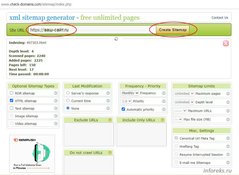 Единственным достойным внимания из всех этих сервисов (вероятно есть и другие, но я просто поленился искать дальше) оказался вот такой “xml sitemap generator — free unlimited pages”, доступный по адресу — https://www.check-domains.com/sitemap/index.php. Попробовал им прогнать html-сайт (примерно 2500 страниц на сервере) и примерно через 10 минут получил возможность для скачивания необходимого файла “sitemap.xml”. Сервис достаточно простой и интуитивно понятный.