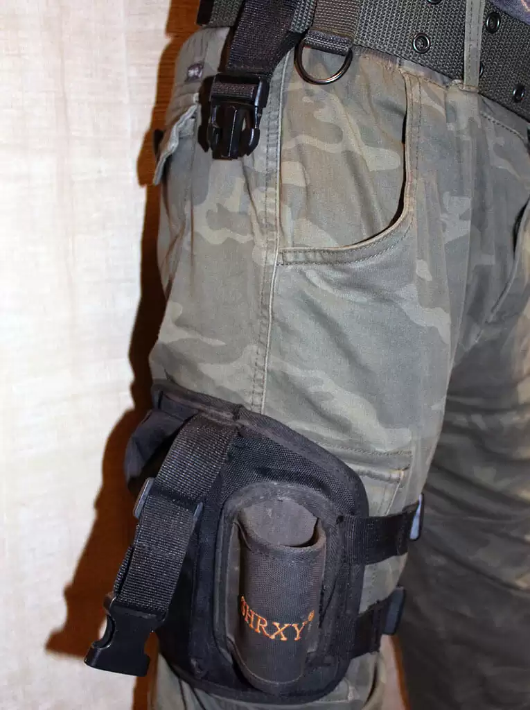 Данная кобура крепится на бедро, можно с правой стороны можно с левой. Для этого она имеет две лямки крепление на ногу с пластиковыми защёлками и регуляторами по ширине бедра. Ещё одна лямка крепится к брючному ремню и регулируется по высоте, имеет крепкий надёжный карабин.