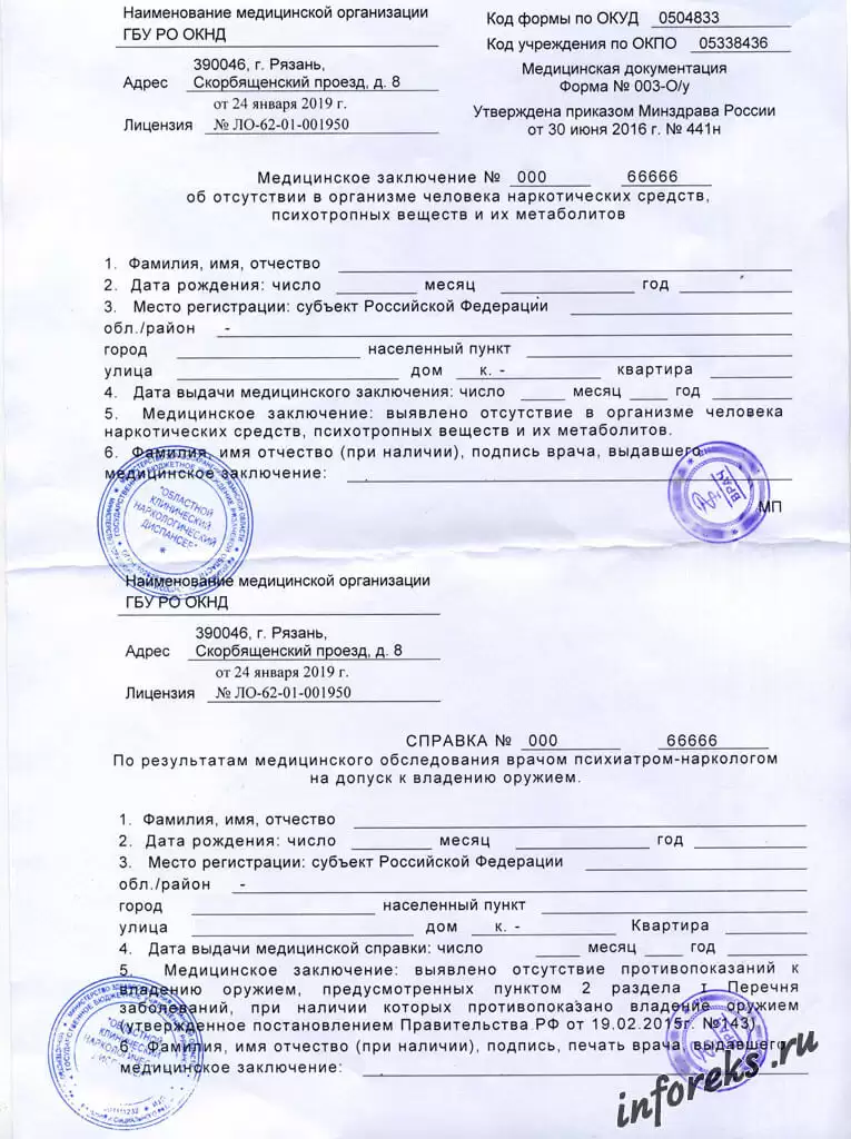 Из них 2000 руб. это нарколог + лаборатория, 500 руб. — психиатр. Оставшиеся 700 руб. делятся на прохождения офтальмолога и терапевта. Терапевт осмотром граждан не занимается, после прохождения всех предыдущих врачей оформляет общее медицинское заключение (“Медицинское заключение об отсутствии медицинских противопоказаний к владению оружием”).