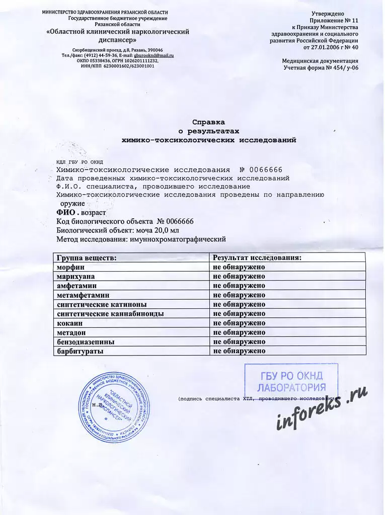 Выйдя из кабинета психиатра занимаем очередь на прием к наркологу, после чего отправляемся сдавать «биоматериал» в туалет напротив. Полученную баночку наполняем “биологическим объектом” в виде мочи. Выйдя из туалета ставим баночку в специальную “корзину” на полу. Анализы периодически забирает женщина из лаборатории, после чего приглашает сдавших биоматериал расписаться в журнале регистрации. Далее тусуемся в очереди и ждём пока нас не вызовет нарколог. Он по результатам анализа мочи выдает справку о результатах химико-токсикологических исследований и медицинское заключение об отсутствии в организме человека наркотических средств, психотропных веществ и их метаболитов.