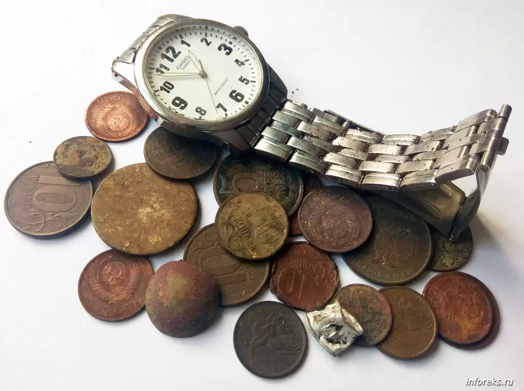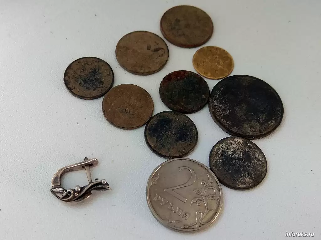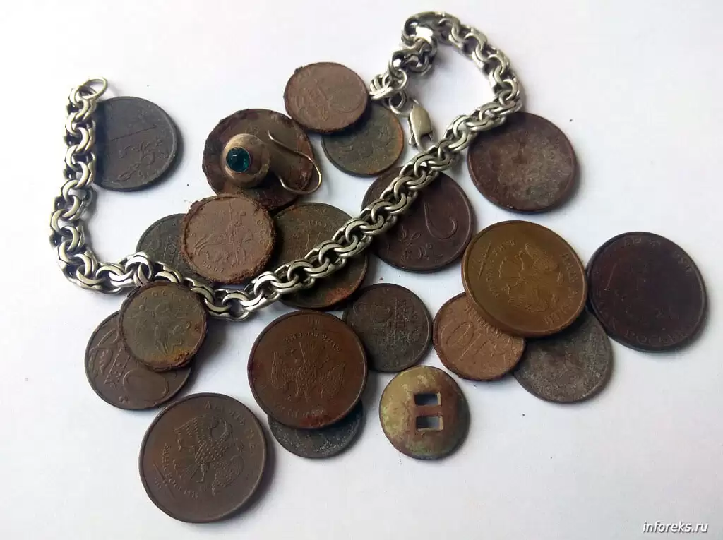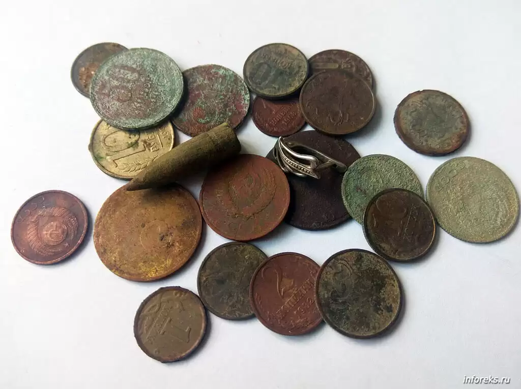Часто встречаются весьма интересные находки. Например, на берегах озер возле старых деревень (что были еще обозначены на картах Менде 1850 года) можно найти царские монетки, крестики, пуговки и т.п. Часто встречаются ранние “советы”, причем иногда весьма редкие и любопытные (как на фото выше — 5 копеек для игры в «орлянку»). Из ювелирки находил пару золотых колец и сережку, из серебра — плетеный наручный браслет, несколько крестиков и сережек. Еще попадались часы, как мужские, так и женские (штуки три-четыре). Все были правда “убитые”, кроме мужских часов Casio с браслетом. Еще бывает всякая бижутерия в виде всяких брошек, заколок и т.п. и детские игрушки (машинки, пистолетики, солдатики). В избытке всегда “ходячка”, пивные, водочные пробки, язычки от банок и прочий мусор. Впрочем этого “добра” предостаточно и на любых пляжах.