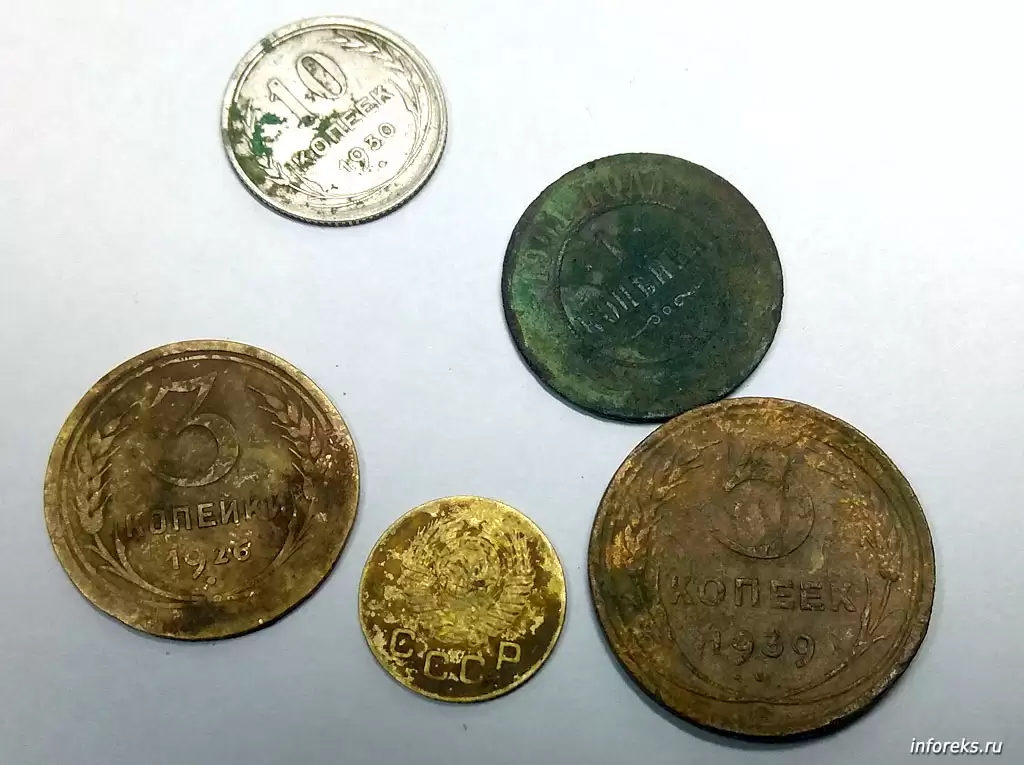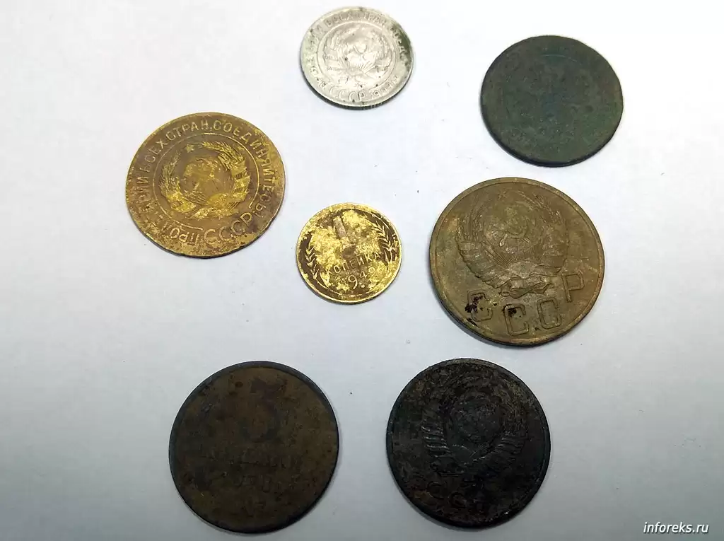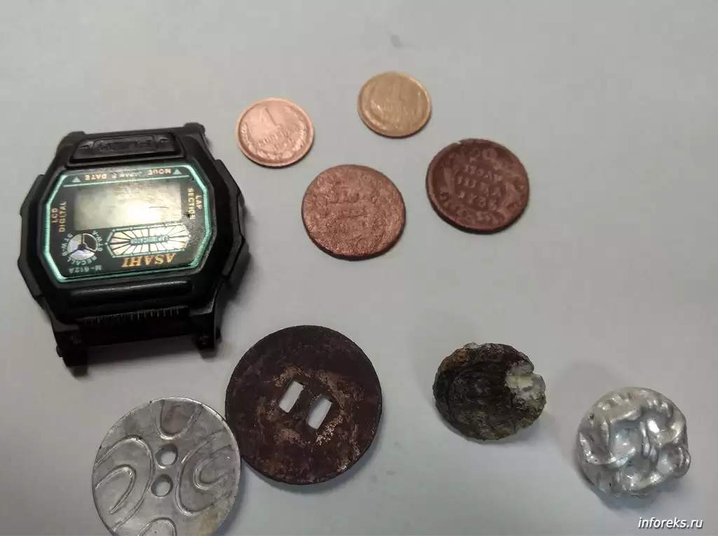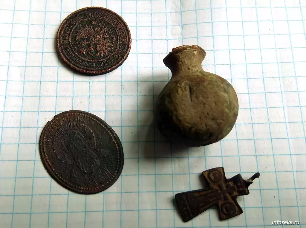 Часто встречаются весьма интересные находки. Например, на берегах озер возле старых деревень (что были еще обозначены на картах Менде 1850 года) можно найти царские монетки, крестики, пуговки и т.п. Часто встречаются ранние “советы”, причем иногда весьма редкие и любопытные (как на фото выше — 5 копеек для игры в «орлянку»). Из ювелирки находил пару золотых колец и сережку, из серебра — плетеный наручный браслет, несколько крестиков и сережек. Еще попадались часы, как мужские, так и женские (штуки три-четыре). Все были правда “убитые”, кроме мужских часов Casio с браслетом. Еще бывает всякая бижутерия в виде всяких брошек, заколок и т.п. и детские игрушки (машинки, пистолетики, солдатики). В избытке всегда “ходячка”, пивные, водочные пробки, язычки от банок и прочий мусор. Впрочем этого “добра” предостаточно и на любых пляжах.