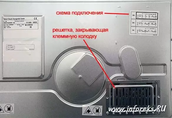 7) Переходим к электроплите BOSCH. На задней стенке имеется табличка с подключением по 1, 2 и 3-х фазной схеме (рис.5). Ниже на двух винтах (под звездочку) установлена решетка, закрывающая доступ к клеммной колодке. Снимаем ее и получаем доступ к клеммной колодке (рис.6).