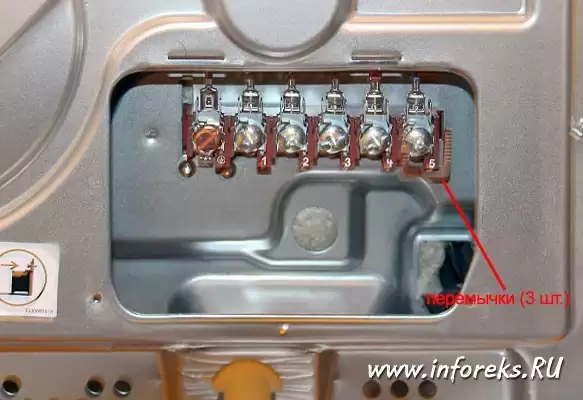 Видим, что на крайней правой клемме прикручены три медные перемычки. Снимаем их и устанавливаем в соответствии со схемой подключения однофазной цепи (рис. 7) — нижний вариант.