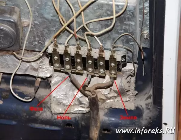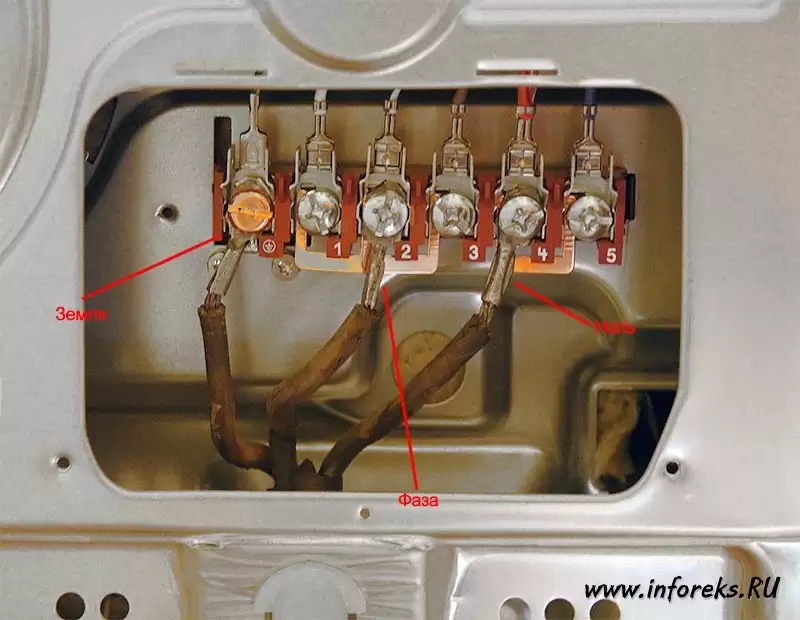 6) Снимаем питающий кабель с вилкой со старой электроплиты. Откручиваем винты и отсоединяем провода от клеммной колодки. Все провода со шнура на колодку обжаты наконечниками «под шайбу», что есть хорошо (не надо их будет опрессовывать в дальнейшем, а сразу прикручивать).