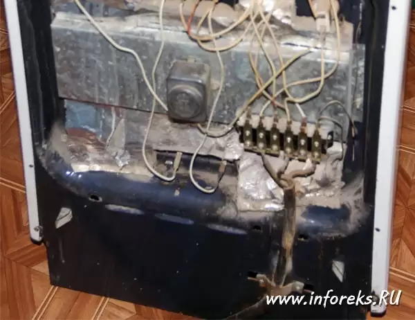 5) У старой плиты «Электра 1001» снимаем заднюю крышку (рис.3) и смотрим на подсоединение шнура к клеммной колодке (рис.4). Видим, что там никаких обозначений нет, цветовая маркировка проводов тоже отсутствует (они все белого цвета).