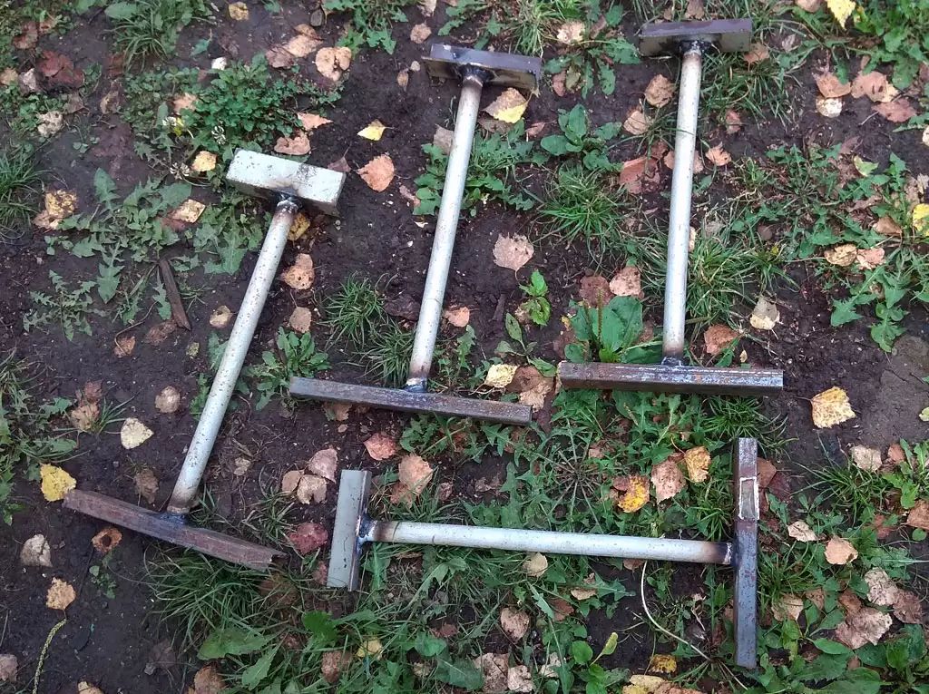 Измерил примерное расстояние от уровня земли до нижней лаги (на каждом пролете) и сварил незамысловатую конструкцию — подпорку. Из материала использовал все, что попалось под руку в сарае. В результате получилось, что каждая подпорка была сварена из 3х частей: металлический уголок 3 мм (30х30) длинной 25-30 см; кусок 25-й водопроводной трубы (длина равна расстоянию от нижней деревянной поперечины забора до земли, плюс ещё запас 2-3 см); куок профиля (20х40, 3 мм), длинной примерно 30-35 см. (в качестве основания).