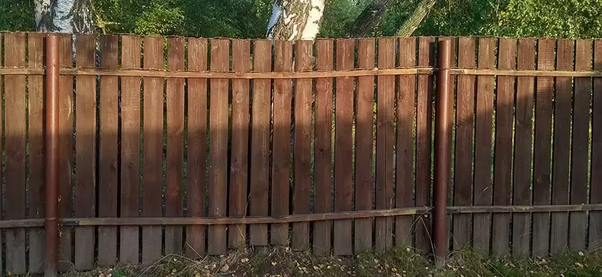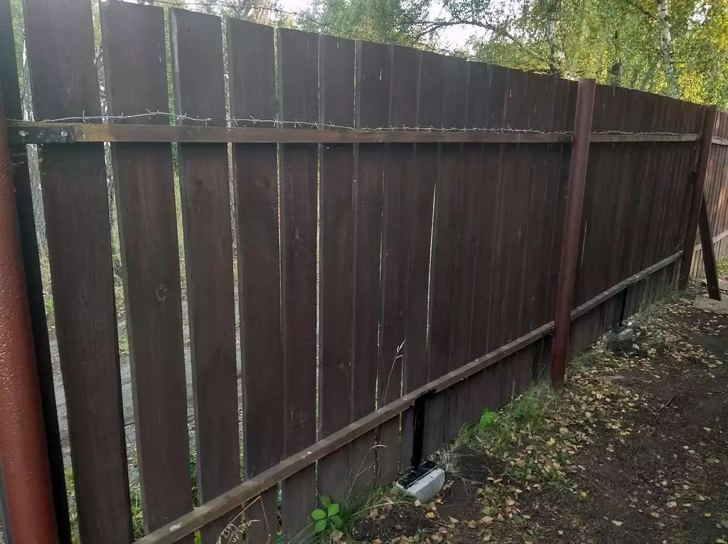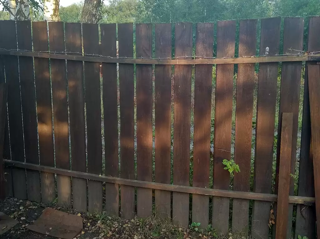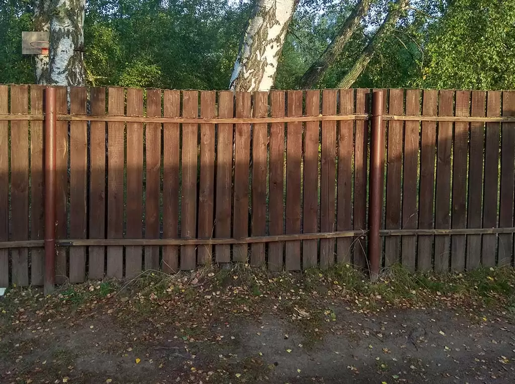 Решил поделиться своим способом выравнивания провисших от времени деревянных поперечин забора (верхняя и нижние горизонтальные прожилины между соседними столбами с набитыми к ним досками). В свое время, при строительстве на даче деревянного забора, на одну из его сторон не хватило нормального бруса для горизонтальных поперечин. Обычно, в качестве прожилин использовал 6-метровый брус (шириной 100 мм и толщиной 50 мм), который крепил на металлические уголки, приваренные к круглым металлическим столбам. Расстояние между столбами забора 3 метра. Соответственно, при таких прочных поперечинах никакого их провисания в центральной части 3-х метрового пролета никогда не случиться. Если смотреть поверху (вдоль пролетов забора), то прибитые доски стоят в ряд, как по струне. Но, вышло так, что “добрый брус” в самый неподходящий момент неожиданно закончился (не хватило на четыре заборные пролета). Решил не заморачиваться и тратить время на поездку за материалом, а «добить» оставшиеся пролеты лагами из имеющегося под рукой сухого бруса (3-х метровый, 40х40 мм). Ведь нет ничего хуже, чем недоделанный забор :). Брус сороковка выглядел достаточно крепким и после обработке специальной краской был установлен в качестве лаг на оставшиеся пролеты. Сначала забор выглядел ровненько и очень даже привлекательно. Но, где-то через год стал замечать проседание лаг в центральной части этих четырех пролетов под весом прибитых досок. На текущий момент (прошло почти четыре года) провис направляющих от горизонтального уровня составил уже порядка 4-5 сантиметров. Соответственно, прикрученные доски к таким хлипким (как оказалось) лагам просели в центральной части пролетов — т.е. “идут” волнами и участок забора смотрится некрасиво. Неоднократно задумывал вариант замены хлипких поперечин на нормальный брус, с последующей перестановкой досок, но как-то все не получалось этим заняться. То времени не было, то лень одолевала. Плюс, нужно было бы еще раз специально варить чудо-краску для обработки (пропитки) новых деревянных прожилин, чтобы не сгнили.