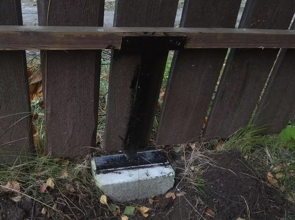 Получившиеся металлические подпорки (копыта) для избежания утапливания в земле под тяжестью досок устанавливал на кирпичи. Между соседними столбами провисшего пролета натягивал шнур по концам верхней направляющей для отбивки горизонтального уровня. Получилась наглядная картина провиса. Далее прикапывал в землю кирпичи на необходимую глубину. Затем с помощью помощника и примитивного рычага, состоящего из пня и 4-метровой металлической трубы, центральная часть пролета приподнималась и выравнивалась по горизонтально натянутому шнуру. Между кирпичом и нижней прожилиной вставлялось «копыто». Таким образом каждый проблемный пролет становился идеально ровным, без следов провисания в центре. В металлических уголках просверлил по паре отверстий и притянул их саморезами к нижним лагам. Далее битумной мастикой покрасил каждую металлическую подпорку чтобы не заржавела и не сгнила. Результат, в принципе, меня порадовал. Теперь, глядя вдоль верха ранее проблемного участка забора, доски стоят как по струне, без эффекта «морских волн». Возможно, такой вариант выравнивания забора кому-то покажется интересным и даже пригодиться практически.