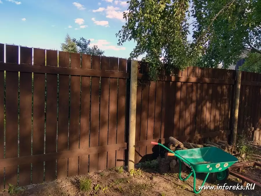 В заключении хотела бы сказать, что на момент публикации этой статьи — нашему забору уже 2 года. Полет нормальный :). Никаких следов плесени, гниения и т.п. на досках не обнаружено. Шведская краска (пропитка для дерева) со своей задачей справилась на ура. Цвет краски за это время особо не изменился и забор выглядит, как новенький (см. фото).