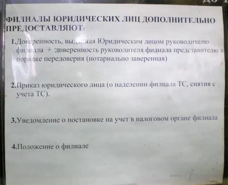 2) Приказ юридического лица (о наделении филиала ТС, снятия с учета ТС).
