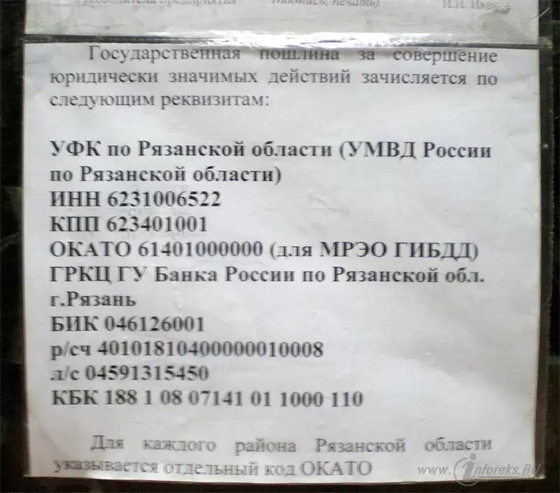 ОКАТО 61401000000 (для МРЭО ГИБДД) ГРКЦ ГУ Банка России по Рязанской обл. г. Рязань