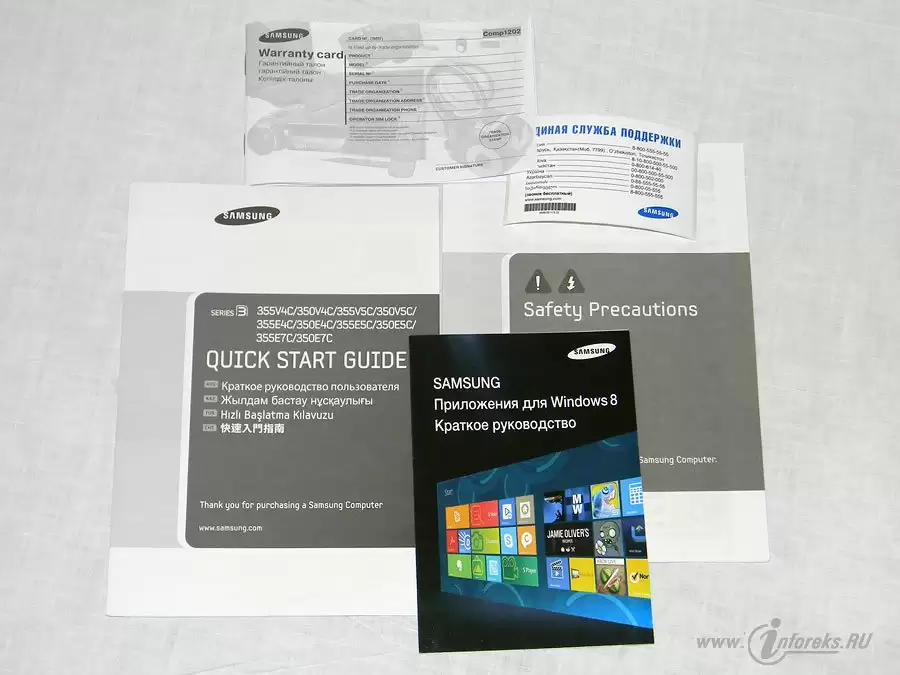 Комплектация ноутбука Samsung 350E5C-S0A не отличается каким либо богатством. В картонной коробке находился: ноутбук, кабель питания с адаптером, аккумулятор, гарантийный талон, краткое руководство пользователя. Вот, собственно и все, ничего лишнего. Никаких дисков с драйверами или программами нет.