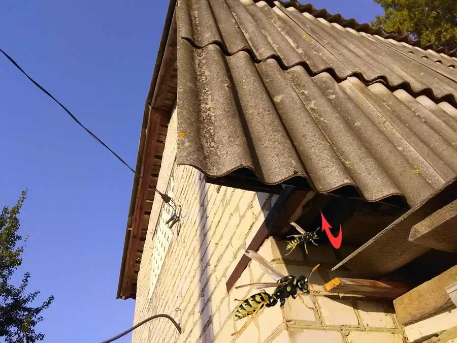 Недавно заметил подозрительную активность ос у входа в веранду дачного дома. Стал присматриваться за полосатыми и увидел, что они стройными (и не очень) рядами залетают туда-сюда под полость ската крыши между этажами. Значит где-то там они облюбовали себе тепленькое местечко в виде осиного гнезда.