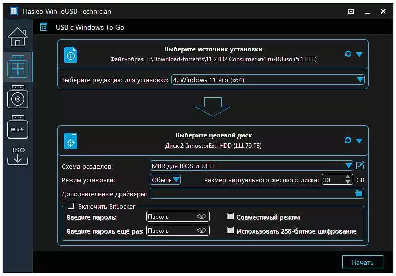 Можем добавить драйверы в нашу установку Windows. В таком случае выбираем папку с драйверами (вернее с резервными копиями драйверов).При необходимости можно включить шифрование диска BitLocker и задать пароль. После вышеперечисленных процедур жмем на кнопку “Начать” и терпеливо ждем окончания процесса.