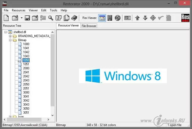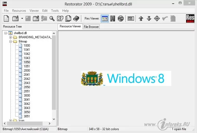 Копируем файл shellbrd.dll из системной папки в любую другую на вашем компьютере. Устанавливаем Restorator. Далее открываем в программе файл shellbrd.dll и находим папку Bitmap. Наш неказистый логотип с гербом SURA SOFT находится в трех вложенных папках: 1050, 2050 и 3050. Заранее подготавливаем нормальный логотип Windows 8 и сохраняем его в расширением bmp в 32-битном варианте. Я использовал его с размерами (348х58 px). Копируем его в буфер обмена (в любом графическом просмоторщике открываем созданный логотип и жмем Ctrl+C). Затем последовательно в каждой из трех папок (1050, 2050 и 3050) правой кнопкой мыши открываем список меню, из него выбираем команду Paste (еще раз напомню, что предварительно наш рисунок bmp надо скопировать в буфер обмена) и делаем замену.