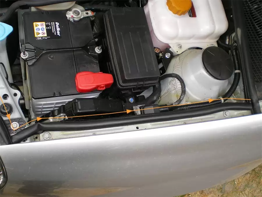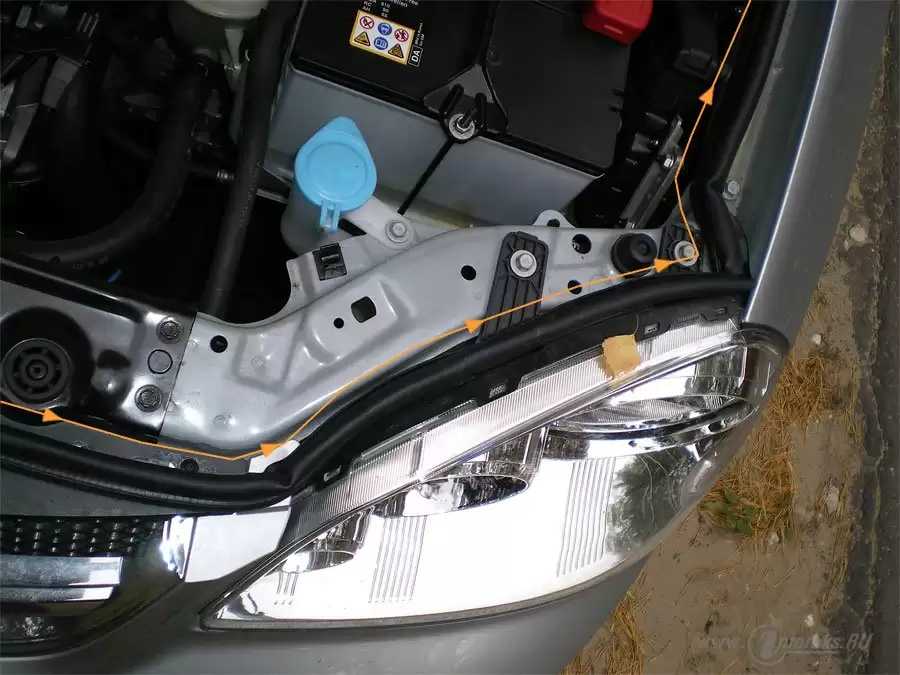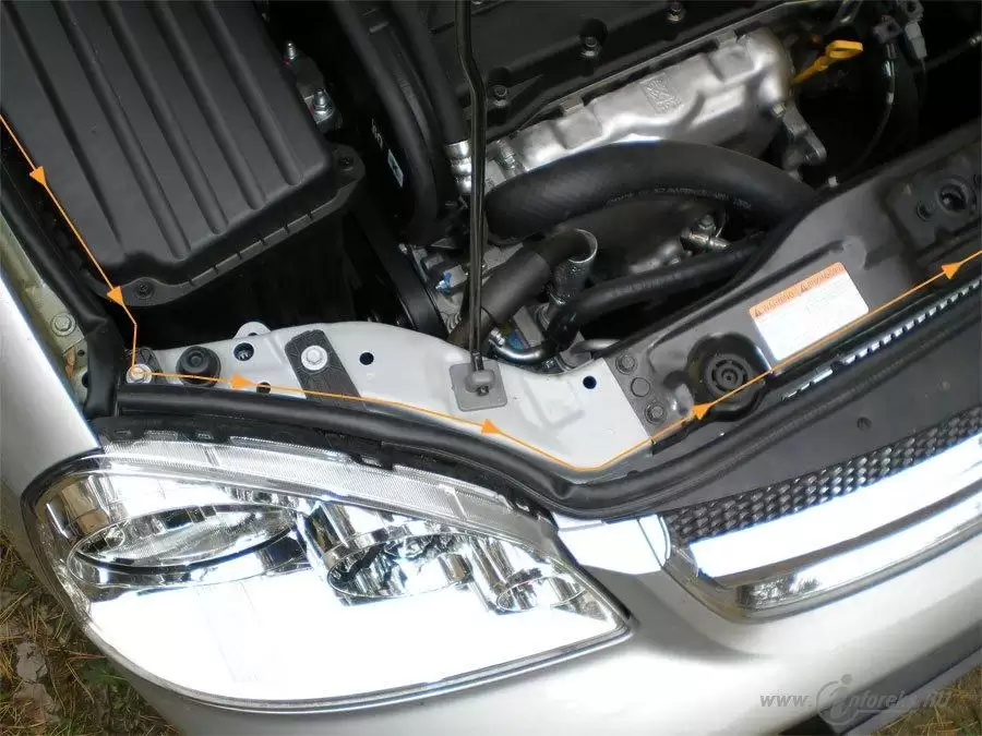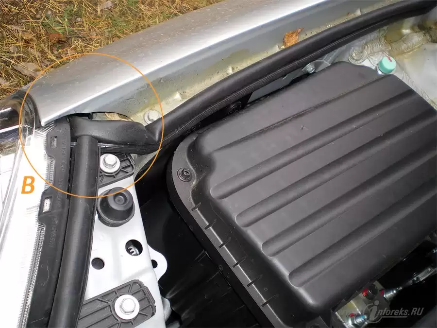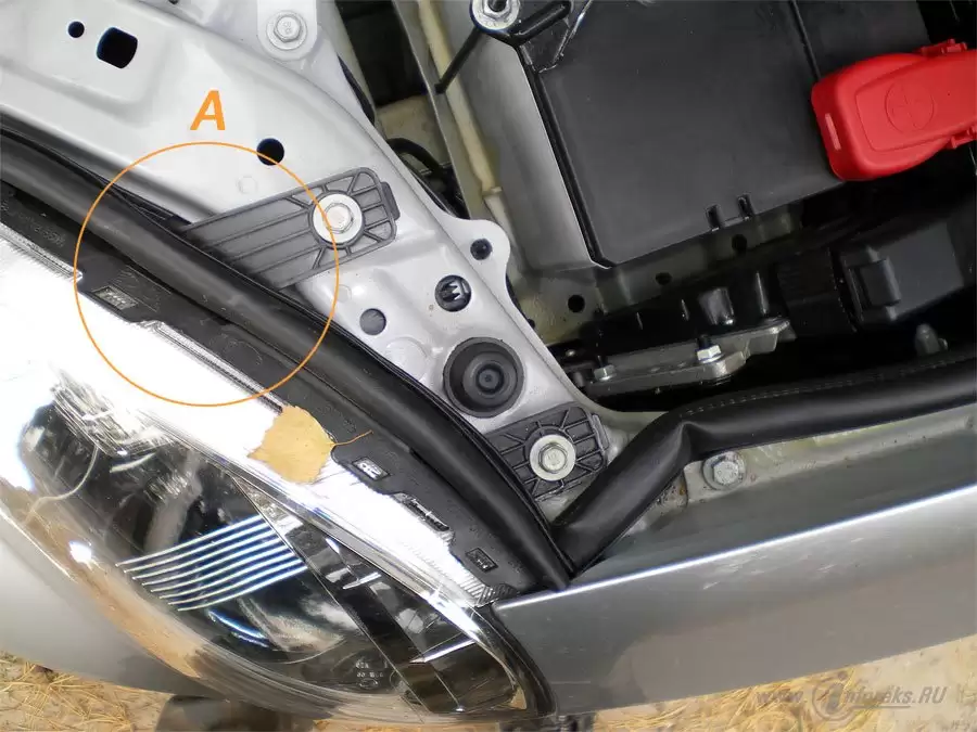 Отмеряем и отрезаем кусок профиля примерно 80-90 см. Крестовой отверткой выворачиваем четыре винта крепления решетки радиатора. Прикладываем профиль и отмечаем маркером отверстия под винты и линии надрезов для изгиба профиля на его концах. Отмеряем и отрезаем кусок уплотнителя (от внешнего края одной фары до внешнего края другой). Затем четырьмя саморезами слегка «прихватываем» профиль к пластиковой пластине. На внешний край профиля надеваем уплотнитель (защелкиваем) и затягиваем саморезы. Чтобы уплотнитель не топорщился в месте крепления фар (см. рисунок – точка А), на его нижней части отмеряем и удаляем (вырезаем) фрагмент резинки с металлическими защелками. После этой процедуры уплотнитель лежит на фаре достаточно ровно, плотно и не требует дополнительной фиксации, например, с помощью двустороннего скотча и т.п. В результате проведенной работы получили – практически полностью закрытую переднюю часть капота отрезком уплотнителя (от фары до фары). Не останавливаемся на достигнутом и идем дальше. Теперь очередь за боками. Отмеряем по размеру крыла (см. фото) два куска уплотнителя. Головкой на 10 мм слегка откручиваем болты крепления крыла и надеваем уплотнитель на его ребро. Затягиваем болты и смотрим на результат. На мой взгляд все получилось достаточно неплохо. Для плотного прилегания и чтобы не было больших зазоров между двумя резинками (см. фото — точка B) советую при разметке боковых уплотнителей прибавить 1-2 см.